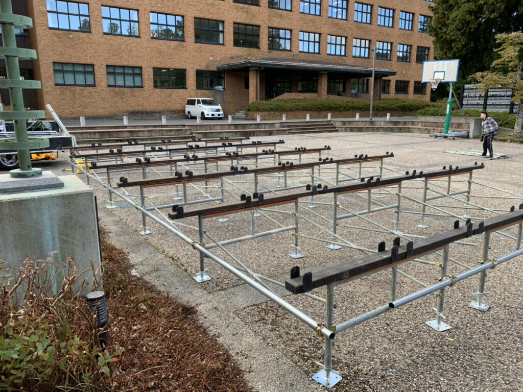 写真に写っている足場同士を繋ぐ×状の筋交いという部材を入れることで、直下荷重を分散させることは勿論ですが、横揺れを大きく削減する事が可能です。よさこいやダンスなど動きの激しいパフォーマンスにも最適です。